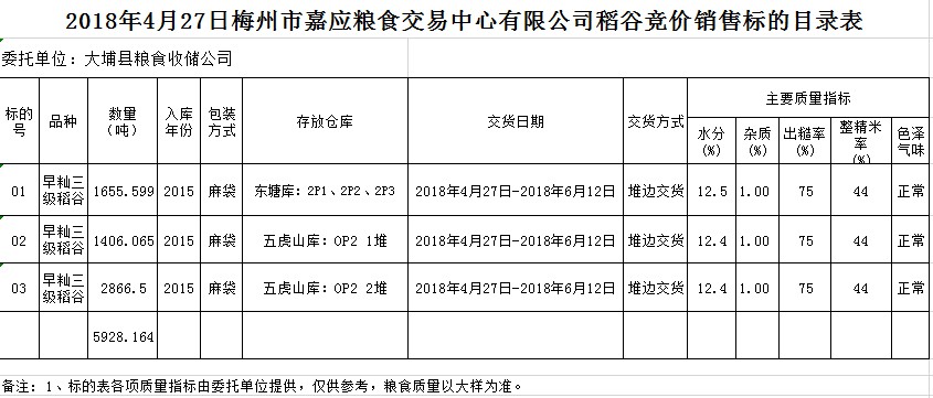 交易時間和地點:2018年4月27日(星期五)上午10時。廣東省梅州市彬芳大道南161號梅州市糧食交易中心3樓。