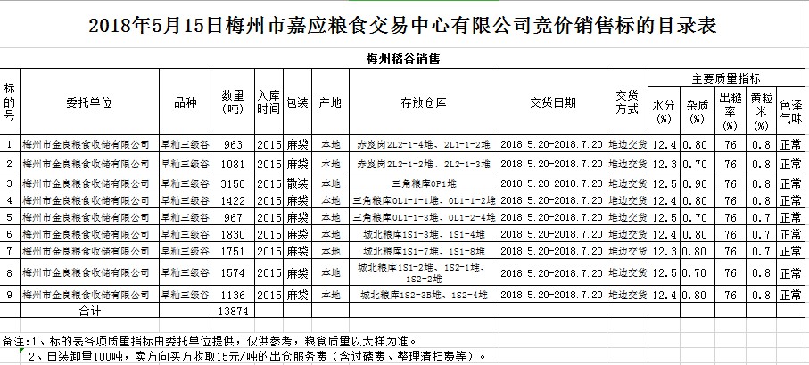 受客戶委托,梅州市嘉應(yīng)糧食交易中心有限公司定于2018年5月15日(星期二)舉辦糧食競價(jià)交易會(huì),梅州市金良糧食收儲(chǔ)有限公司擬銷售早秈稻13874噸。