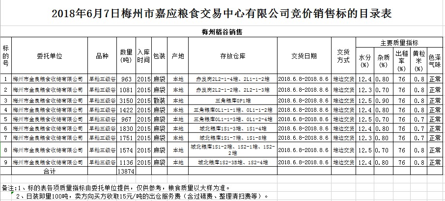 受客戶委托,梅州市嘉應(yīng)糧食交易中心有限公司定于2018年6月7日(星期四)舉辦糧食競價(jià)交易會(huì),梅州市金良糧食收儲(chǔ)有限公司擬銷售早秈稻13874噸。