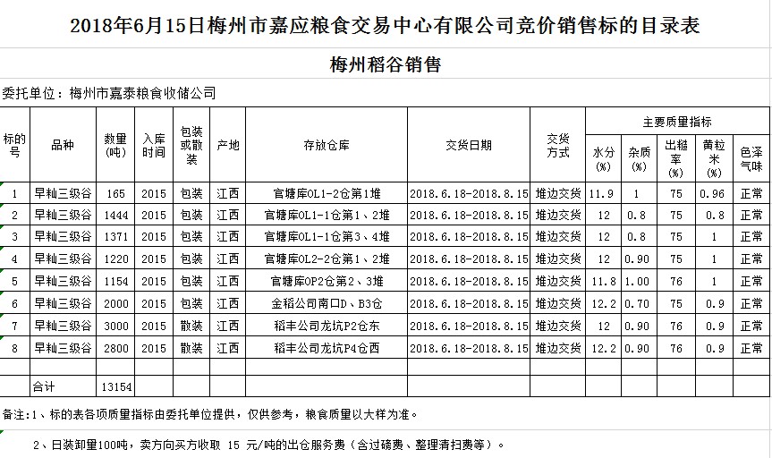 受客戶委托,梅州市嘉應(yīng)糧食交易中心有限公司定于2018年6月15日(星期五)舉辦糧食競價(jià)交易會(huì),梅州市嘉泰糧食收儲(chǔ)公司擬銷售早秈稻13154噸。