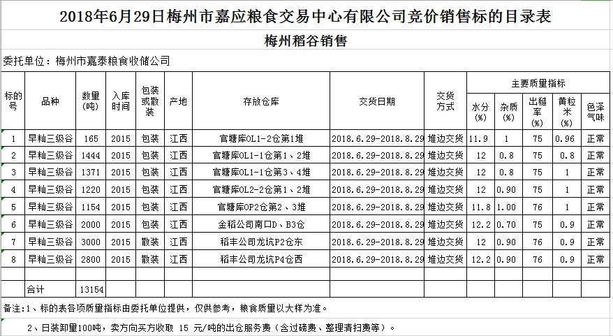 受客戶委托,梅州市嘉應(yīng)糧食交易中心有限公司定于2018年6月29日(星期五)舉辦糧食競價(jià)交易會,梅州市嘉泰糧食收儲公司擬銷售早秈稻13154噸。