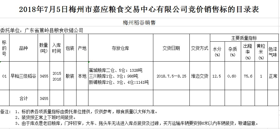 交易時間和地點(diǎn):2018年7月5日(星期四)上午10時。廣東省梅州市彬芳大道南161號梅州市糧食交易中心3樓。