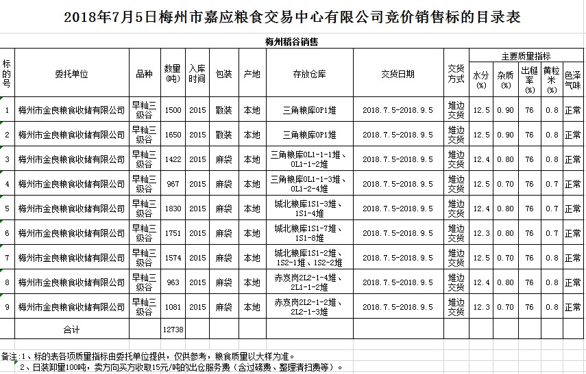 交易時間和地點:2018年7月5日(星期四)上午10時15分。廣東省梅州市彬芳大道南161號梅州市糧食交易中心3樓。