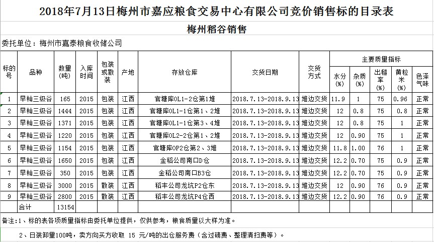 受客戶委托,梅州市嘉應(yīng)糧食交易中心有限公司定于2018年7月13日(星期五)舉辦糧食競價(jià)交易會(huì),梅州市嘉泰糧食收儲(chǔ)公司擬銷售早秈稻13154噸。