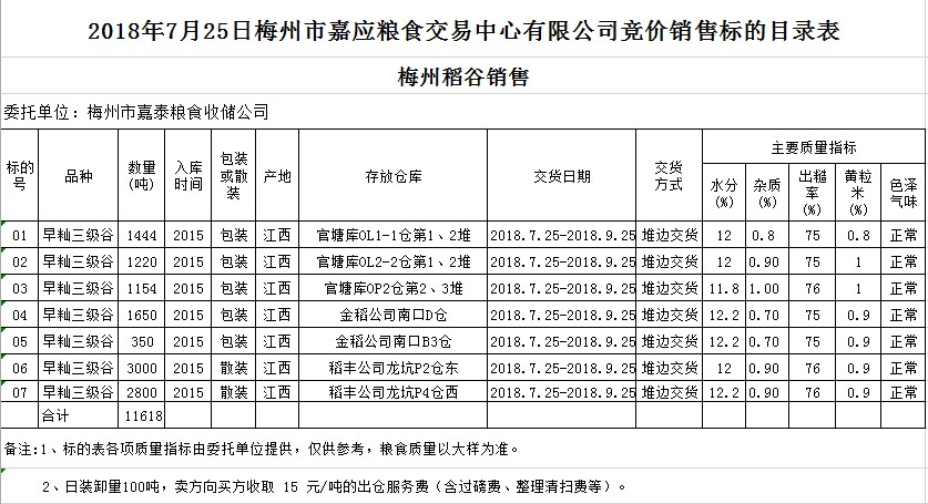 交易時間和地點:2018年7月25日(星期三)上午10時。廣東省梅州市彬芳大道南161號梅州市糧食交易中心3樓。